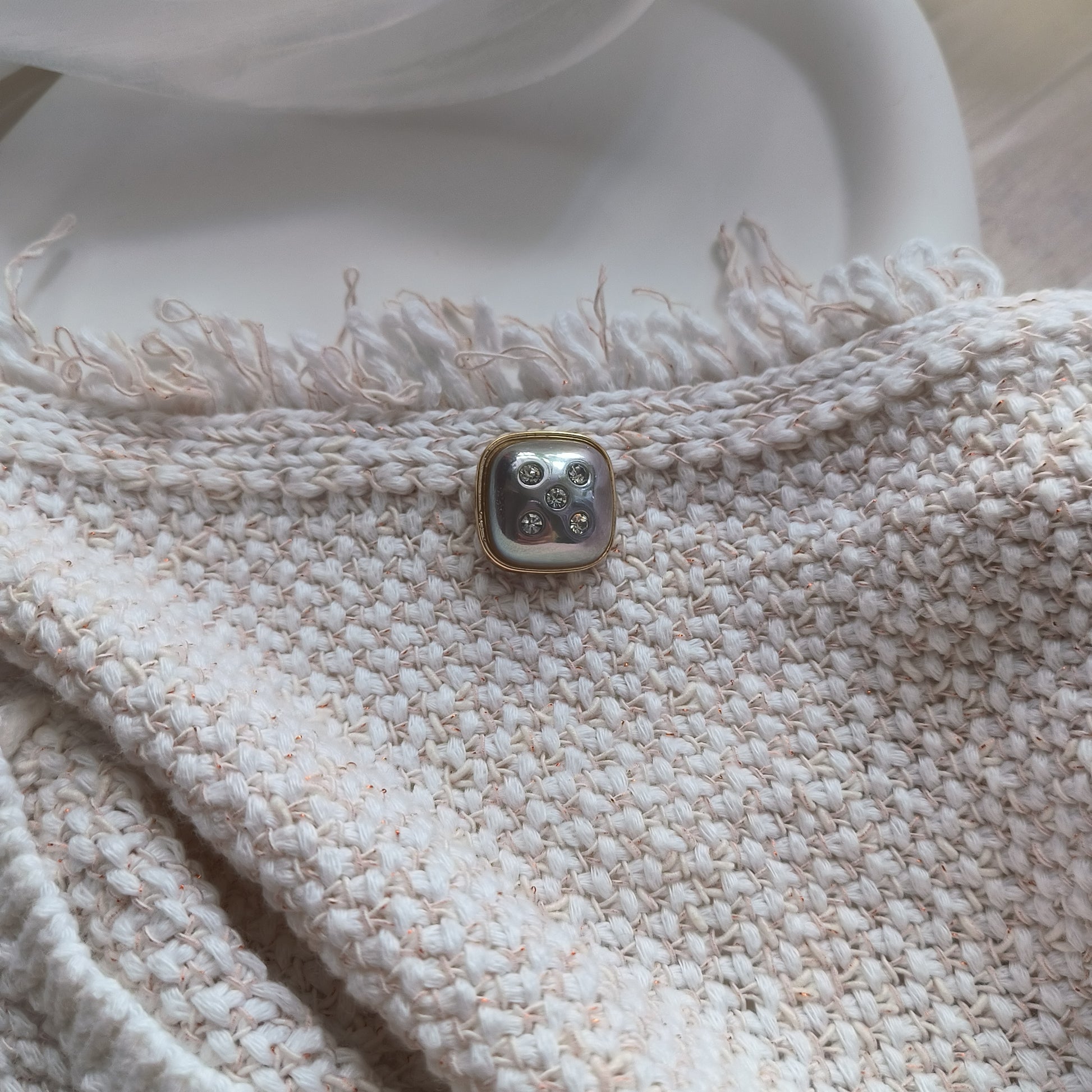 The metal chassis with rhinestone buttons is perfect for wearing with jackets, denim skirts, etc.